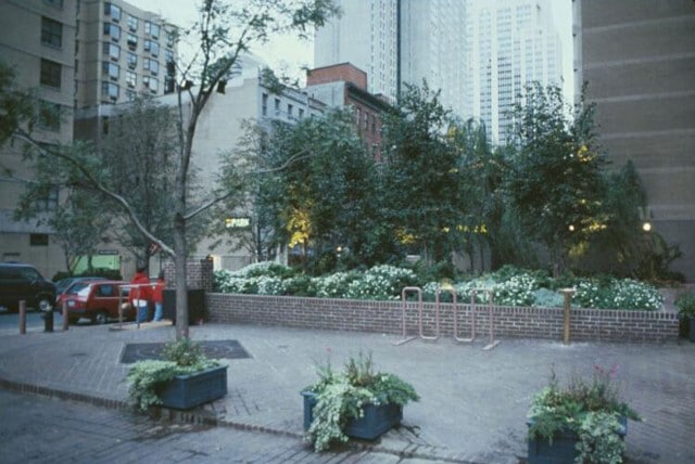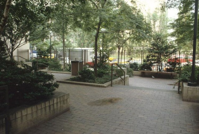 A lush landscape of overhanging trees, shrubs, and flowers covers much of this north-facing residential plaza, on the south side of East 70th Street east...continued.