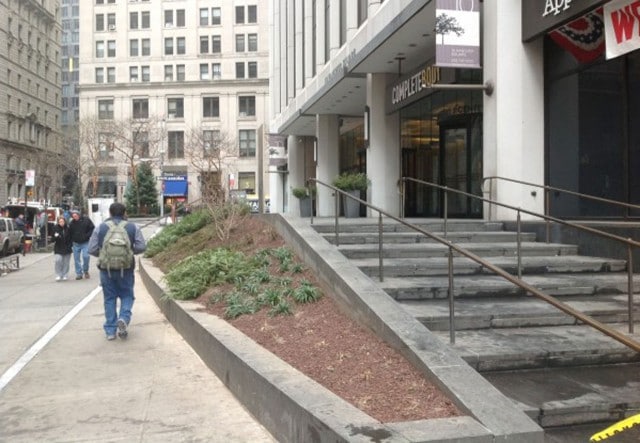 In this pedestrian-congested area of Broadway, the fact that this plaza widens the sidewalk along the new addition to the old Irving Trust building, and...continued.