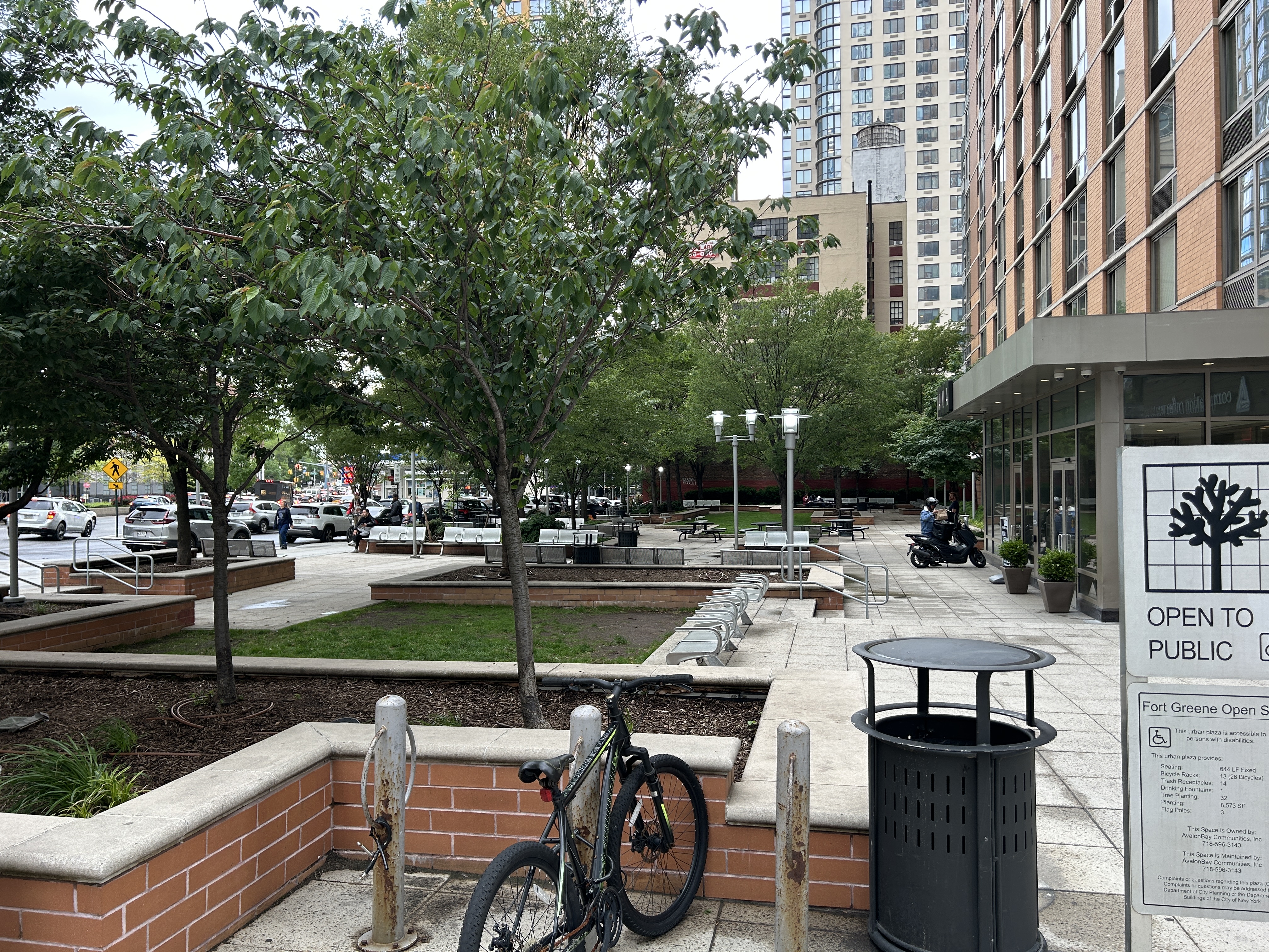 This mid-size residential plaza boasts several benches as well as landscaping including large trees that offer shade.